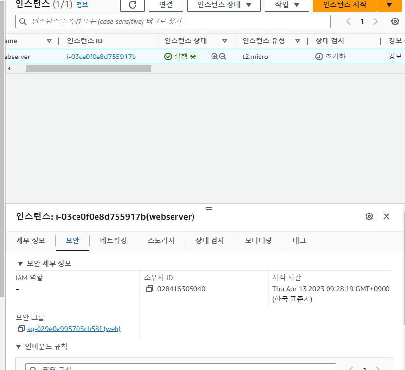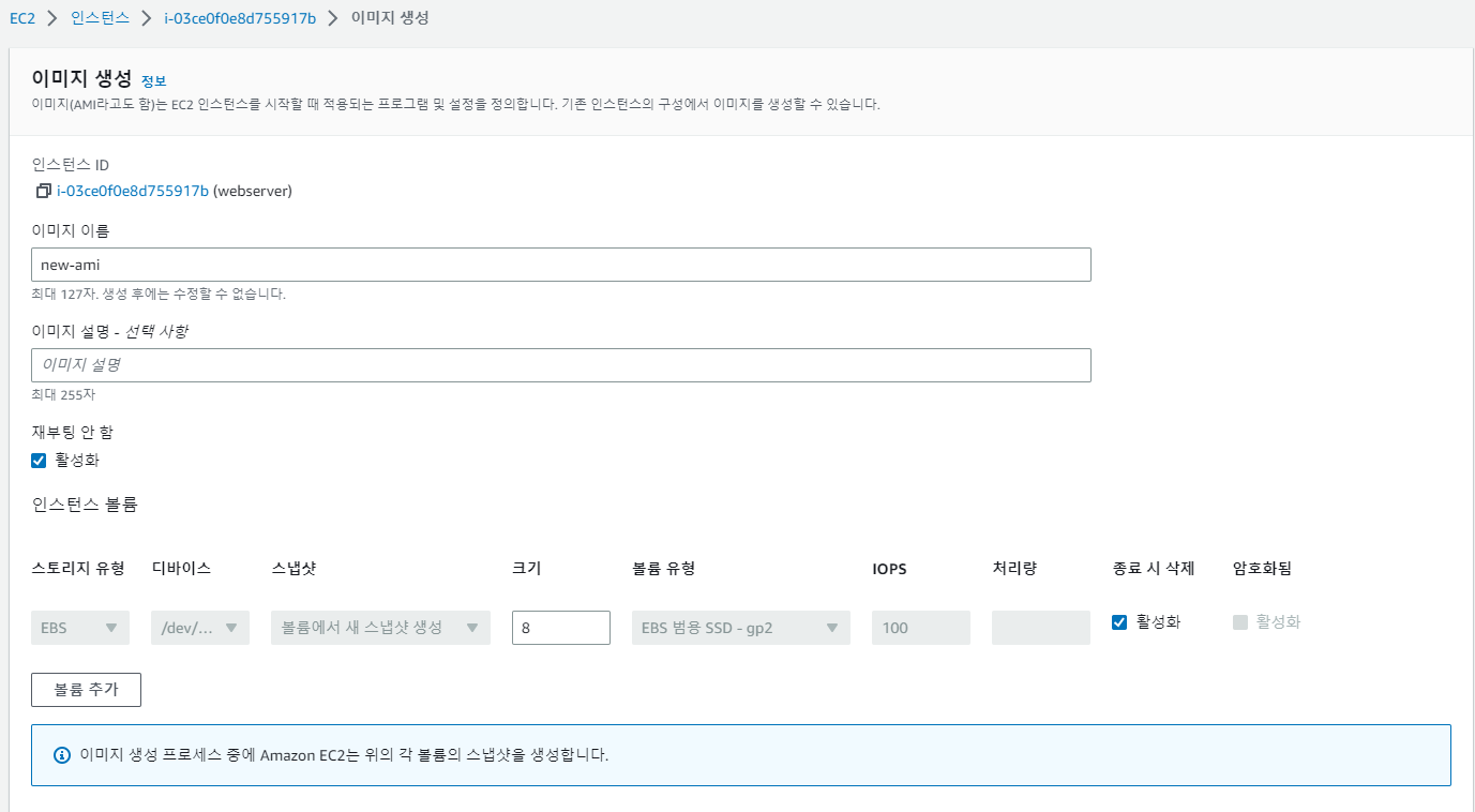 - 재부팅 안함: 인스턴스가 이미지로 만들어져있다가, 다시 인스턴스로 만들어질 때, 재부팅을 안해도 활성화 되도록 설정